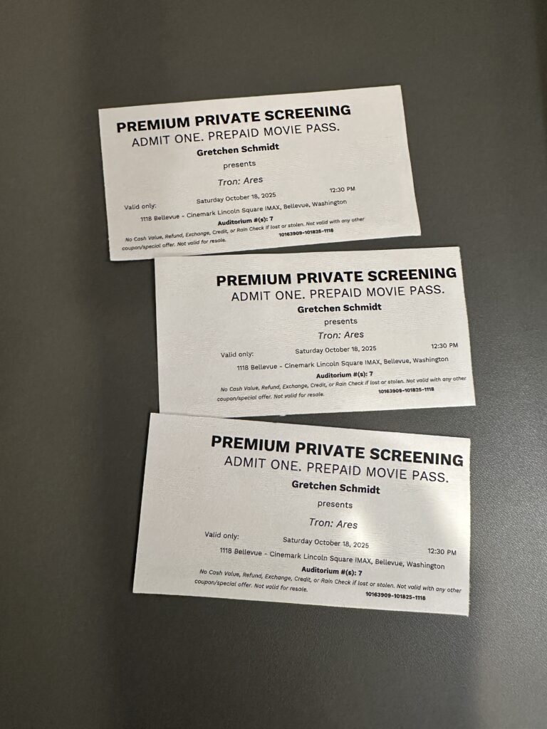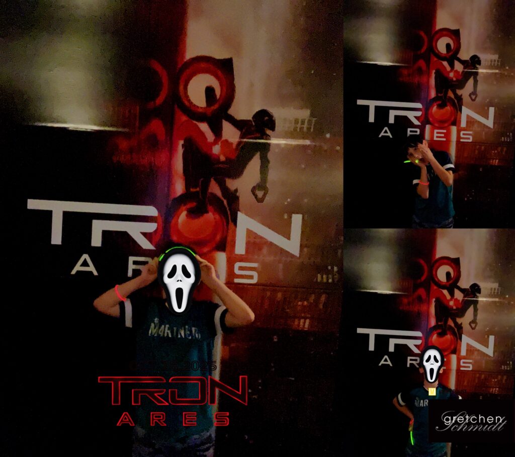 We had a great time on Saturday October 18, 2025 at our private showing of Tron: Ares movie matinee at Cinemark Bellevue! I hope everyone had as much fun as I did. We had a pile of glow sticks, lots of black pleather, a photos booth and popcorn.